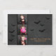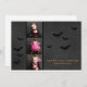Esta tarjeta de Halloween presenta un fondo negro angustiado con murciélagos volando por ahí y una tira de fotos a lo largo de la izquierda y tu saludo personalizado a la derecha.