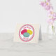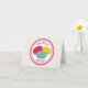 Un notecard que ofrece un ilustracion de tres macarons franceses (rosa, azul, y amarillo) dentro de un círculo rosado y azul decorativo con el texto rosado "Bonjour" y "hola." Esconda dentro.
