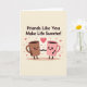 This greeting card shows two cute mugs in the center, holding hands like close friends. One mug is a deep mocha brown and the other is a soft pink, and both have round black eyes, rosy cheeks, and big happy smiles. Their little arms are thin and black, reaching toward each other to show warmth and connection. The background is a light creamy pastel, with small pink hearts and tiny star shapes floating around them for a sweet, loving feel ❤️. At the top, the card says “Friends Like You Make Life Sweeter!” in dark brown block letters that stand out clearly. Gentle shading and small shadows under the mugs give the picture a bit of depth without making it busy 💌🍫.