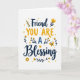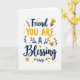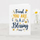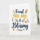Designed with a bright white background, this card centers on a friendly message that feels like two close friends sharing a quiet, affectionate moment ❤️. The main text reads “Friend YOU ARE A Blessing,” arranged in stacked lines so the words fill the middle of the front. “Friend” and “Blessing” appear in dark navy, flowing lettering, while “YOU ARE” stands out in golden yellow with crisp, easy-to-read letter shapes. A smaller “A” sits between them in a softer blue, acting like a gentle bridge in the phrase. Around the wording, slim navy branches curve outward with small golden yellow flowers, like a simple bouquet offered with care 🌼. Tiny golden yellow hearts are sprinkled across the open white space, adding a light, affectionate sparkle without crowding the design. On the right side, a golden yellow butterfly hovers near the text, angled as if it just drifted in beside the blossoms.