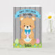 This card features a friendly cartoon bear in warm tan and brown, seated front and center with rounded paws holding a softly glowing pastel egg, as if offering it with quiet affection 🌷. A sky-blue bow tie sits at its neck, matching a light blue banner that curves across the top of the design. On the banner, a short Easter greeting appears in a slender, flowing letter style, set in a darker blue so it stands out clearly. The bear’s rosy cheeks and wide, gentle eyes give it a tender, companionable look, like it’s sharing the moment with someone close 🐇. Behind the character, a textured gray wooden fence stretches across the background, adding a cozy, rustic setting. Along the bottom edge, bright green grass is sprinkled with small flowers in yellow, blue, and pink, and two patterned eggs in soft green and pink peek out from the lawn. The scene uses soft outlines and smooth pastel shading, with the blue banner arcing above the bear and the decorated eggs nestled low in the grass.
