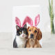 This card shows a close-up portrait of two cozy household companions—a black-and-white cat and a golden-brown dog—posed side by side against a bright white background. They wear plush pink bunny ear headbands 🐰, and the soft fabric folds sit high on their heads like a shared costume for two close friends. The cat’s yellow eyes meet yours with a calm, slightly bashful look, set above a small pink nose and long white whiskers. The dog’s dark eyes lean toward the cat with a tender, protective gaze, its warm coat catching the gentle light. The lighting stays even and soft, bringing out fine fur texture and the smooth sheen of the pink ears without harsh shadows. Near the top, a short Easter greeting appears in light pink lettering, centered above their heads, with a smaller line in gray placed just below it. The oversized pink ears arch upward like rounded petals 🌷 against the white space.