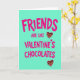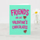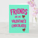 This greeting card for friends has a teal background that sets a calm, friendly scene for a sweet message. In the center, the text reads “FRIENDS ARE LIKE VALENTINE’S CHOCOLATES” in bright fuchsia block letters with a rounded, easy-to-read style. The words are stacked on three lines, with “ARE LIKE” smaller so “FRIENDS” and “CHOCOLATES” stand out most. In “VALENTINE’S,” the apostrophe is replaced by a tiny heart, which adds a simple romantic touch. Near the text, there are two small fuchsia heart-shaped chocolate boxes that look like little gifts. Inside each box are different chocolates, including smooth round truffles and pieces with nutty tops, suggesting that friends come in many wonderful types ❤️❤️