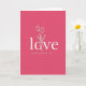 This card features a rich fuchsia background that sets a romantic, modern mood ❤️. Centered on the front, the word “love” appears in white, using a simple sans-serif style that feels smooth and confident. The letter “o” is replaced by a thin white outline of a hand gently holding three tulips, as if offering them to someone special 🥰. The tulip stems curve upward with small petals at the top, giving the design a tender, giving gesture without adding extra clutter. A faint shadow behind the white lettering and flower outline makes the elements look slightly raised from the pink surface. Beneath the main word, “HAPPY VALENTINE’S DAY” is set in smaller white capital letters, aligned under the center. The composition stays minimal and balanced, with lots of open pink space around the white art and text. The tulips are drawn in fine white lines, with three blooms sitting just above the hand inside the “o” shape.