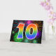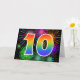 El frente de este emocionante, divertido y vibrante diseño de tarjetas de felicitación presenta un patrón colorido inspirado en fuegos artificiales de celebración, junto con el número "10" que tiene un arcoiris multicolor como patrón gradiente, en un fondo de color negro. En el interior aparece un mensaje de saludo de personalizable, o tal vez se pueda borrar y dejar en blanco si se va a escribir un mensaje a mano. Una tarjeta de felicitación como esta podría ser una manera divertida de celebrar el décimo cumpleaños de alguien, o tal vez el décimo aniversario de una pareja, o algún otro décimo acontecimiento. [~Z0000342]