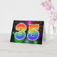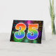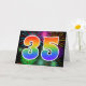 El frente de este emocionante, divertido y vibrante diseño de tarjetas de felicitación presenta un colorido patrón inspirado en fuegos artificiales de celebración, junto con el número "35" que presenta un patrón gradiente inspirado en el arcoiris multicolor, sobre un fondo de color negro. En el interior aparece un mensaje de saludo personalizado, o tal vez se pueda borrar y dejar en blanco si se va a escribir un mensaje a mano. Una tarjeta de saludo como esta podría ser usada para enviar un mensaje reconociendo el 35 cumpleaños de alguien, o tal vez el 35 aniversario de un boda de una pareja, o algún otro evento del 35. [~Z0000342]