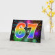 El frente de este emocionante, divertido y vibrante diseño de tarjetas de felicitación presenta un colorido patrón inspirado en fuegos artificiales de celebración, junto con el número "67" que presenta un patrón gradiente inspirado en el arcoiris multicolor, sobre un fondo de color negro. El interior presenta un mensaje de saludo personalizado, o tal vez se pueda borrar y dejar en blanco si se va a escribir un mensaje a mano. Una tarjeta de felicitación como esta puede ser una manera divertida y feliz de enviar un mensaje a alguien que está celebrando su sexagésimo séptimo cumpleaños, o tal vez a una pareja que celebra su sexagésimo séptimo aniversario de bodas, o a alguien que celebra algún otro acontecimiento número número 67. [~Z0000342]