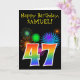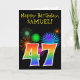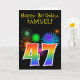 El frente de este divertido y vibrante diseño de tarjetas de felicitación de cumpleaños presenta un colorido patrón inspirado en fuegos artificiales de celebración, junto con el número "47" que tiene un arcoiris multicolor como patrón gradiente, en un fondo de color negro. La parte delantera también incluye un mensaje de bienvenida de cumpleaños, incluido un nombre de destinatario personalizado. El interior presenta un mensaje de bienvenida de cumpleaños de personalizado, o tal vez podría ser borrado y dejado en blanco si se va a escribir un mensaje a mano. Una tarjeta de cumpleaños personalizado como esta podría ser una manera divertida de enviar deseos de cumpleaños a alguien que está celebrando su cumpleaños cuarenta y siete. [~Z0000330]