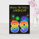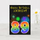 La parte delantera de este divertido y vibrante diseño de tarjetas de felicitación de cumpleaños presenta un patrón colorido inspirado en fuegos artificiales de celebración, junto con el número "89" que presenta un arcoíris multicolor como un patrón gradiente, en un fondo de color negro. En la parte delantera también se incluye un mensaje de bienvenida de cumpleaños, incluido un nombre de destinatario personalizado. El interior presenta un mensaje de bienvenida de cumpleaños de personalizable, o tal vez podría ser borrado y dejado en blanco si se va a escribir un mensaje a mano. Una tarjeta de cumpleaños personalizada como esta podría ser una manera divertida de enviar un mensaje para celebrar el 89º cumpleaños de alguien. [~Z0000330]