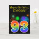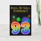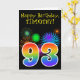 La parte delantera de este divertido y vibrante diseño de tarjetas de felicitación de cumpleaños presenta un patrón colorido inspirado en fuegos artificiales de celebración, junto con el número "93" que tiene un patrón gradiente inspirado en el arcoiris multicolor, sobre un fondo de color negro. La parte delantera también incluye un mensaje de bienvenida de cumpleaños, incluido un nombre del destinatario del personalizable. El interior presenta un mensaje de bienvenida de cumpleaños personalizado, o tal vez podría ser borrado y dejado en blanco si se va a escribir un mensaje a mano. Una tarjeta de cumpleaños como esta podría ser una manera divertida de enviar deseos de cumpleaños a alguien que esté celebrando su noventa tercer cumpleaños. [~Z0000330]