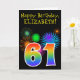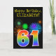 La parte delantera de este divertido y vibrante diseño de tarjetas de felicitación de cumpleaños presenta un patrón colorido inspirado en fuegos artificiales de celebración, junto con el número "61" que presenta un arcoíris multicolor como un patrón gradiente, en un fondo de color negro. En la parte delantera también se incluye un mensaje de bienvenida de cumpleaños, incluido un nombre de destinatario personalizado. El interior presenta un mensaje de bienvenida de cumpleaños personalizado, o tal vez podría ser borrado y dejado en blanco si se va a escribir un mensaje a mano. Una tarjeta de cumpleaños de personalizable como esta podría ser una manera divertida de enviar un mensaje en celebración de los sesenta primeros años de alguien. [~Z0000330]