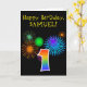 La parte delantera de este divertido y vibrante diseño de tarjetas de felicitación de cumpleaños presenta un colorido patrón inspirado en fuegos artificiales de celebración, junto con el número "1", que presenta un patrón gradiente inspirado en el arcoiris multicolor, sobre un fondo de color negro. En la parte delantera también aparece un mensaje de bienvenida de cumpleaños, incluido un nombre de destinatario personalizado. El interior presenta un mensaje de bienvenida de cumpleaños personalizado, o tal vez podría ser borrado y dejado en blanco si se va a escribir un mensaje a mano. Una tarjeta de cumpleaños de personalizable como esta podría ser una manera divertida de reconocer el primer cumpleaños de alguien. [~Z0000330]