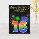La parte delantera de este divertido y vibrante diseño de tarjetas de felicitación de cumpleaños presenta un colorido patrón inspirado en fuegos artificiales de celebración, junto con el número "16" que presenta un arcoíris multicolor como un patrón gradiente, en un fondo de color negro. La parte delantera también incluye un mensaje de bienvenida de cumpleaños, incluido un nombre del destinatario del personalizable. El interior presenta un mensaje de bienvenida de cumpleaños de personalizable, o tal vez podría ser borrado y dejado en blanco si se va a escribir un mensaje a mano. Una tarjeta de cumpleaños de personalizable como esta podría ser una manera divertida de enviar un mensaje en celebración del 16 cumpleaños de alguien. [~Z0000330]