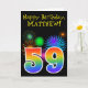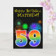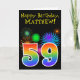 La parte delantera de este divertido y vibrante diseño de tarjetas de felicitación de cumpleaños presenta un colorido patrón inspirado en fuegos artificiales de celebración, junto con el número "59" que presenta un arcoiris multicolor como un patrón gradiente, en un fondo de color negro. La parte delantera también incluye un mensaje de bienvenida de cumpleaños, incluido un nombre del destinatario del personalizable. El interior presenta un mensaje de bienvenida de cumpleaños personalizado, o tal vez podría ser borrado y dejado en blanco si se va a escribir un mensaje a mano. Una tarjeta de cumpleaños como esta puede ser una manera divertida de enviar deseos de cumpleaños a alguien que está celebrando su cumpleaños número cincuenta. [~Z0000330]