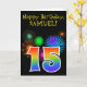 La parte delantera de este divertido y vibrante diseño de tarjetas de felicitación de cumpleaños presenta un colorido patrón inspirado en fuegos artificiales de celebración, junto con el número "15" que tiene un patrón gradiente inspirado en el arcoiris multicolor, sobre un fondo de color negro. La parte delantera también incluye un mensaje de bienvenida de cumpleaños, incluido un nombre del destinatario del personalizable. El interior presenta un mensaje de bienvenida de cumpleaños personalizado, o tal vez podría ser borrado y dejado en blanco si se va a escribir un mensaje a mano. Una tarjeta de personalizable como esta puede ser una manera divertida de enviar deseos de cumpleaños a alguien que está celebrando su décimo quinto cumpleaños. [~Z0000330]