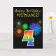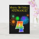 El frente de este divertido y vibrante diseño de tarjeta de felicitación de cumpleaños presenta un patrón colorido inspirado en fuegos artificiales de celebración, junto con el número "4" que tiene un patrón de gradiente inspirado en arcoíris multicolor, sobre un fondo de color negro. La parte delantera también presenta un mensaje de felicitación de cumpleaños, incluyendo un nombre de destinatario personalizado. El interior presenta un mensaje de felicitación de cumpleaños personalizado, o quizás podría estar limpio y en blanco si se desea escribir un mensaje a mano en su lugar. Una tarjeta de cumpleaños personalizada como esta podría ser una forma divertida de enviar un mensaje en celebración del cuarto cumpleaños de alguien. [~Z0000330]