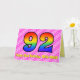 Este diseño festivo y animado de tarjetas de felicitación de 92 años tiene un frente con un gran número "92" que tiene un patrón colorido inspirado en la apariencia de un espectro arcoiris, en un corazón rosa oscuro y rosa claro formas rayas fondo patrón. La parte delantera también incluye el mensaje "Feliz cumpleaños 92", y un nombre de destinatario de personalizable. El interior presenta un mensaje personalizado de bienvenida de cumpleaños, o tal vez podría ser borrado y dejado en blanco si se va a escribir un mensaje a mano. Una tarjeta de cumpleaños personalizada como esta podría ser una manera divertida y feliz de reconocer el 90 segundo cumpleaños de alguien. [~Z0000418]