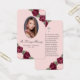 Elegante tarjeta de memoria floral roja y rosa/tarjeta de oración funeraria con una foto adornada con rosas rojas rosa y borgoña y flores de aliento del bebé en un fondo de color negro.