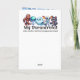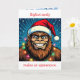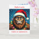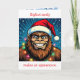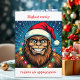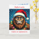 A funny sasquatch Christmas card with a cute bigfoot pun inside. Comic book style pop art bigfoot smiling with a Santa and Christmas lights on.