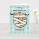 A personalized Halloween card for son featuring a funny mummy chocolate chip cookie on the front against a blue gingham design. Inside is a funny Halloween maze with a pizza slice trick or treating! The inside Halloween card message can be personalized if wanted and lastly a pumpkin shaped Halloween word search is on the back for more Halloween fun! This Halloween activity greeting card for boys will make a unique Halloween card this year!