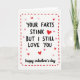 This Valentine’s Day card shares affection with humor and honesty. Centered on a bright white background, bold black lettering reads, “YOUR FARTS STINK BUT I STILL LOVE YOU,” making the message clear and amusing at first glance. Beneath it, “Happy Valentine’s Day” appears in a softer script that balances the joke with warmth. A red dashed border frames the card, giving it a handmade, thoughtful look. Small hearts in shades of red and pink are scattered around the text, adding charm and romance. One heart cleverly replaces the letter “A” in “FARTS,” adding a visual joke. This card is perfect for couples who appreciate laughter, real love, and celebrating imperfections together. 💕.