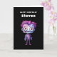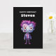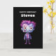 Tarjeta de cumpleaños con un lindo ilustracion. Monstruo Frankenstein con pelo rosado y púrpura y traje y corbata de dapper.