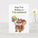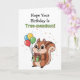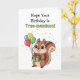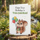 Adorable cartoon squirrel holding a birthday gift and balloons on the front of the birthday card. Inside is a cute squirrel pun. This birthday card is cute for anyone.