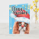 Un divertido y bonito dibujo a lápiz de color realista de la cara de un perro español del rey Charles Cavalier vestido con un sombrero de Santa rojo, con una falsa piel blanca, con pantallas de alambre y una nariz roja de reno. Está enredado en luces de árbol de Navidad y está enmarcado por largas luces verticales de cuerda y un fondo azul cielo. La portada exterior dice "fleas navidog" y el interior "feliz cumpleaños". Ideal para los deseos de fin de año de negocios a los clientes o como una adorable tarjeta de vacaciones a amigos y familia.