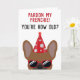 Esta graciosa tarjeta de cumpleaños de bulldog francés seguramente pondrá una sonrisa en la cara del niño de cumpleaños o chica que tiene sentido del humor. El diseño presenta un ilustracion de un bulldog francés de estilo french de estilo frenético rojo con un gorra fiesta rojo y gafas de sol con la frase "¡Perdona a mi francesa! Eres tan viejo" escrito en el frente. Este diseño también está disponible con diferentes bulldoges franceses de colores.