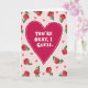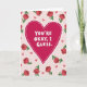This Valentine's Day card features a big fuchsia heart in the center, outlined in white with a dashed border inside it. Across the heart, the words “YOU’RE OKAY, I GUESS.” appear in chunky white letters that look like simple printed type, easy to read and a little dry on purpose. The background is a soft pastel pink, with coral-colored roses and green stems and leaves scattered around the edges. Small solid pink hearts float between the roses, all drawn with thin dark outlines that give it a doodled look. The message lands like a teasing compliment, which can feel extra affectionate if you and your person share that kind of humor 🥰. It’s a sweet way to say “I care about you” without getting too serious, while still feeling honest and kind ❤️. Share it to pass along Valentine’s Day sentiments in a way that feels true to your relationship.