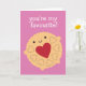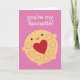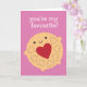 Una galleta feliz kawaii Jammie Dodger con un corazón rojo de mermelada sobre un fondo rosa. Perfecta para el Día de San Valentín, aniversarios o tu mejor amigo.