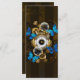 Composición de reloj de vapor redondo con dial numérico romano negro, decorado con arcos de oro y latón, mariposas morfo azules y lentes dañadas sobre fondo rayado marrón. Estilo Steampunk.