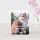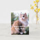 Esta tarjeta de cumpleaños para tu hermana amante de los gatos presenta un hermoso gato calicó de pelo largo sentado en un tocón de árbol en otoño. Los colores del gato son butterscotch, gris y blanco. En la parte delantera, el texto dice: "Feliz cumpleaños a mi hermana".