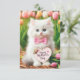 Delicia a tu mamá con esta adorable tarjeta de Día de la Madre de estilo acuarela que presenta un gatito blanco esponjoso sentado en un vibrante campo de tulipanes. El gatito lleva una pequeña corbata de lazo rosa y sostiene un letrero en forma de corazón con "Feliz Día de la Madre" escrito en elegante letra cursiva. Perfecta para amantes de los gatos y cualquiera que aprecie diseños florales dulces. ¡Una forma conmovedora de mostrar tu amor y aprecio!