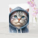 Arte acuarela linda de un gato atigrado gris y blanco que lleva una sudadera azul para combinar con esos hermosos ojos azules en esta tarjeta de saludo en blanco.