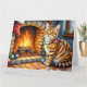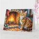 Tarjeta Gato Bengal junto a chimenea con luces de Navidad
