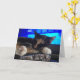 El diseño de esta tarjeta de saludo es una fotografía original de un gato durmiendo frente a un televisor. El gato es un calico, con patas blancas que se acercan a la cámara. Un programa sobre finanzas está en televisión, con un gráfico azul brillante que incluye las palabras "FINANCIACIÓN VENTURE CAPITAL". Debajo del gato, mostrando su interés en los asuntos financieros, están las palabras "CATIPALISTA DE VENTURA", en texto con un patrón de piel de gato y un resplandor azul detrás de él, como el resplandor azul detrás de la piel del gato en sus bordes.