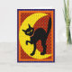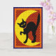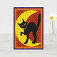Una tarjeta de saludo de Halloween con un gato negro practicando a través de la luna. Los bordes de tipo "tejido" con patrones mejoran esta imagen colorida.