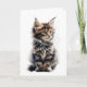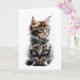 Hermoso gato Maine Coon con rayas de atigrado grises, negras, marrones y blancas en esta tarjeta de saludo en blanco.