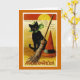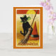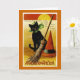 Ilustracion de la vintage tarjeta de saludo de Halloween que muestra un gato negro, escoba de brujas y gorra con el texto "Bruja o ave de hadas amistosas, llena el deseo que deseas hoy".