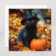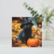 ¡Tarjeta con un adorable gato negro usando el gorra de una bruja! Esta pequeña corbata posa con una calabaza. El otoño deja alfombras en el suelo del bosque. ¡Un regalo perfecto para las celebraciones de Halloween!