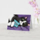 Tarjeta de felicitación adaptable para todas las ocasiones. Ofrece un gato lindo del smoking que juega con una almohada azul del catnip. Creado de un © original de la pintura Lisa 2009 Marie Robinson/todos los derechos reservados