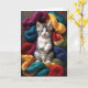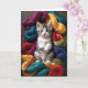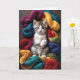 Hermoso gato tabby gris y blanco con ojos azules se acomodó entre hilos coloridos de lana en esta tarjeta de felicitación en blanco.