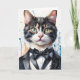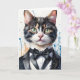 Arte de salpicaduras de acuarela de un gato atigrado con esmoquin y corbata negra en esta tarjeta de felicitación en blanco.