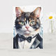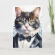 Arte de salpicaduras de acuarela de un gato atigrado en esmoquin y corbatín negro en esta tarjeta de felicitación en blanco.