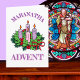 Delante: ilustracion de una corona advenediza hecha de evergreens y holly con las cuatro velas encendidas entre la palabra arqueada Maranatha ("Ven, Señor") y la palabra horizontal Advenimiento, ambas en grandes letras mayúsculas. Adentro: Un deseo de esperanza, paz, alegría y amor (los temas de las cuatro semanas de Advent) y un pasaje bíblico sobre la preparación del camino del Señor desde el Evangelio de San Mateo (Mateo 3:1-3). + Crédito de la imagen: Vela de Advenimiento en blanco y negro generada por imitoloringdiseños a través de Pixabay, modificada y coloreada por Saints_Ainfinito; Elionas también vía Pixabay.