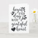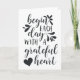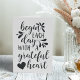 Difunde una actitud de gratitud. Nuestro diseño de tarjeta de saludo de tipografía escrita a mano incluye la cita "comienza cada día con un corazón agradecido" en un guión de caligrafía con letras de suave y fuera de negro adornado con chispas y un ilustracion cardíaco. En blanco para el mensaje, o bien, agregue un mensaje preimpreso utilizando las herramientas personalizares de Zazzle.