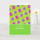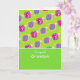 This greeting card features an energetic pattern across the top two-thirds, set on a lime-green background that feels like a party in motion. Alternating through the design are rounded magenta squares sprinkled with white dots and tiny green star shapes, each edged with a ruffled cerulean outline, alongside deep-purple, barrel-like cylinders wrapped in bright teal diagonal stripes. Small off-white rectangles and lightly speckled outlines sit between the larger shapes, adding a gentle rhythm that keeps the eye moving. The bottom third shifts to a solid emerald-green panel that calms the busy pattern above, like a steady place to land. Centered on that green panel, the words “To a special Grandson” appear in flowing white lettering, standing out clearly without crowding the space. The contrast between the lively top and the grounded base suggests closeness, like a warm bond held steady beneath all the fun, with a little 🌷 tucked into the mood. In the upper section, the magenta shapes repeat in neat rows while the purple striped cylinders alternate between them, creating a lively grid that feels almost like a dance 🐇.