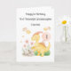 This birthday card is suitable for a granddaughter or daughter's first, 2nd or 3rd birthday. The design includes the number 1 (which can be changed or removed), birthday stars, watercolour grass, flowers and rocks, and a yellow and pink dinosaur with balloon.