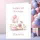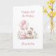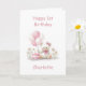 Make her first birthday even more memorable with this delightful teddy bear card. The lovable bear, decorated with cute pink bows, holds a bunch of pink and white balloons while sitting next to a pastel pink birthday cake crowned with one shining candle.